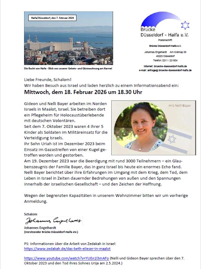 Der Verein „Brücke Düsseldorf-Haifa“ will einen praktischen Beitrag zur Verständigung und Friedensarbeit zwischen Deutschland und Israel und zur Versöhnung leisten – auf der Grundlage der frohen Botschaft der Bibel.